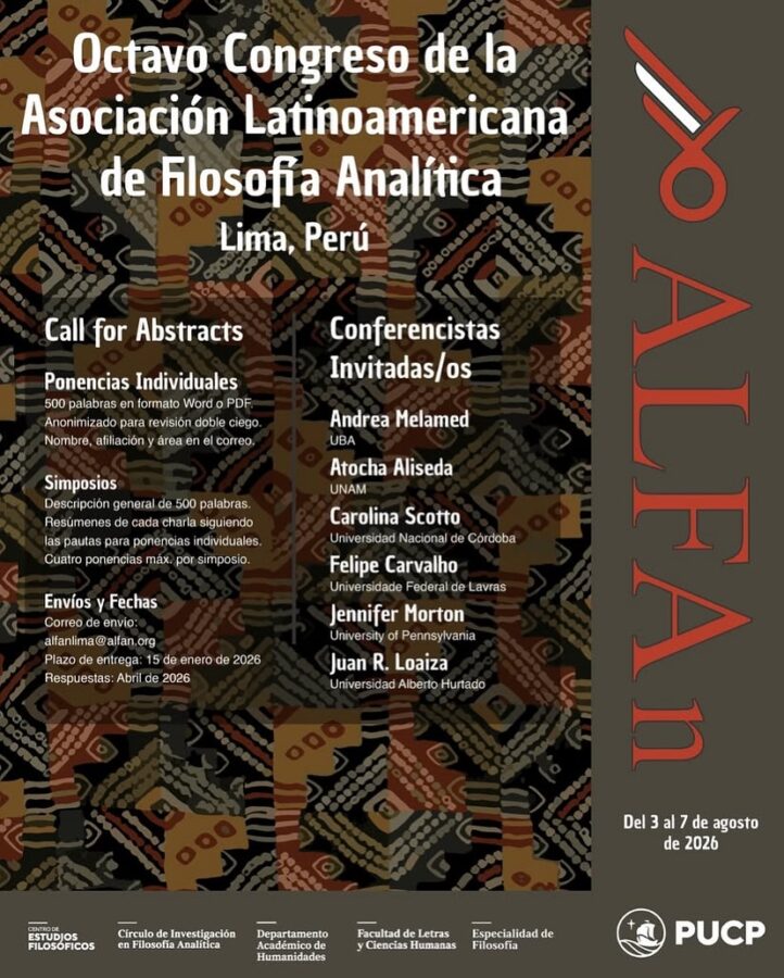 La Asociación Latinoamericana de Filosofía Analítica (ALFAn) convoca a la presentación de resúmenes y ponencias para su VIll Congreso, a realizarse en Lima (Perú), con sede anfitriona en la Pontificia Universidad Católica del Perú (PUCP), del 3 al 7 de agosto de 2026.